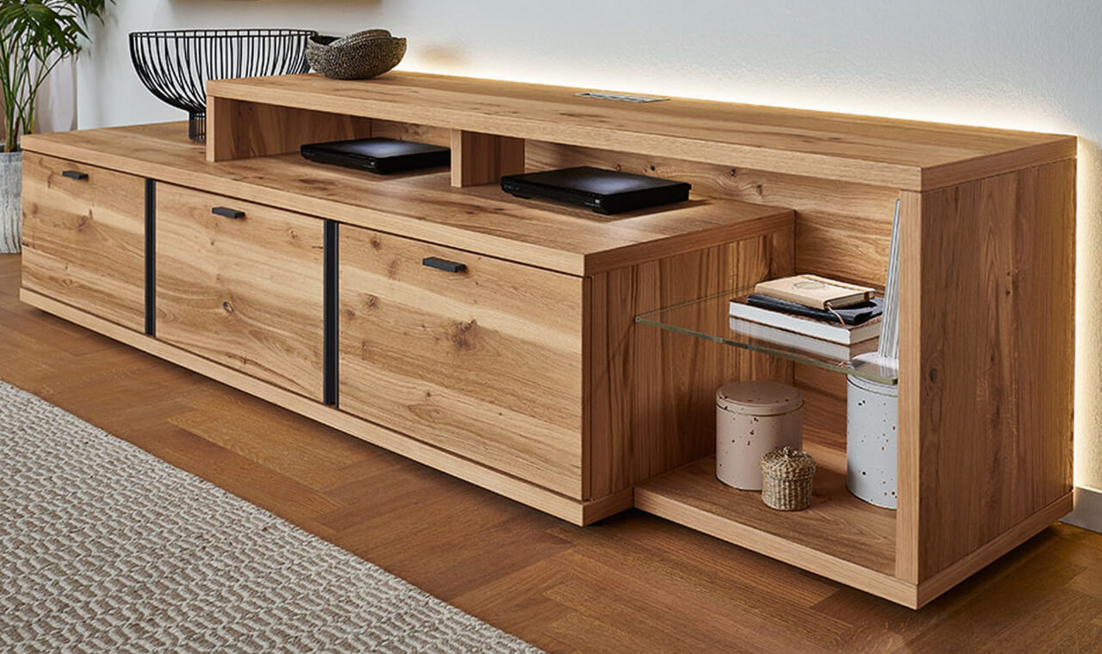 In the PLAN X range of designs, X4 is the "timeless" one. Expressively grained wood and metal handles as sophisticated design elements define the character of the furniture. The graining appears to dance in the light, and the metal handles running vertically to this add a modern highlight that makes the X4 look timelessly beautiful in living rooms. Plus there is plenty of storage space – for perfection in design and function. Look forward to a design in oak rustico light with an oiled finish, metal handles in anthracite, LED lighting and gently closing drawers with self-closing mechanism.
