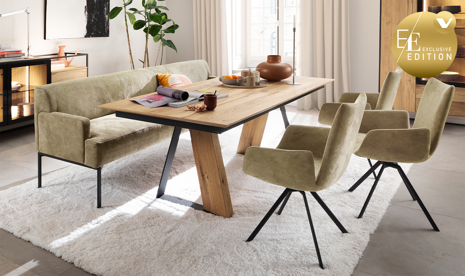 Die extra bequeme Polsterbank mit Armlehnen schafft ein zeitlos modernes Ambiente.