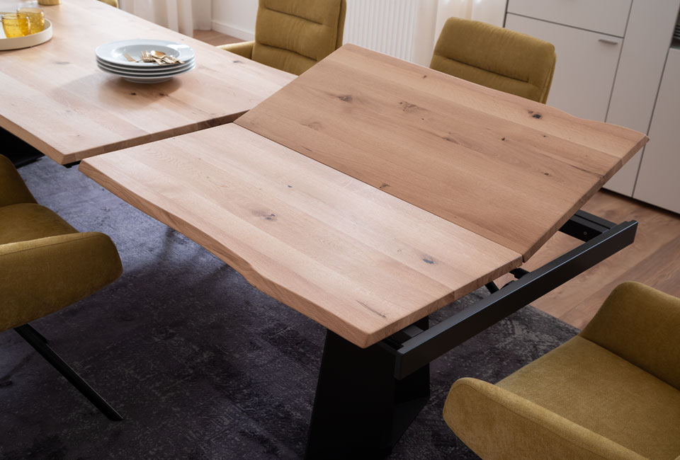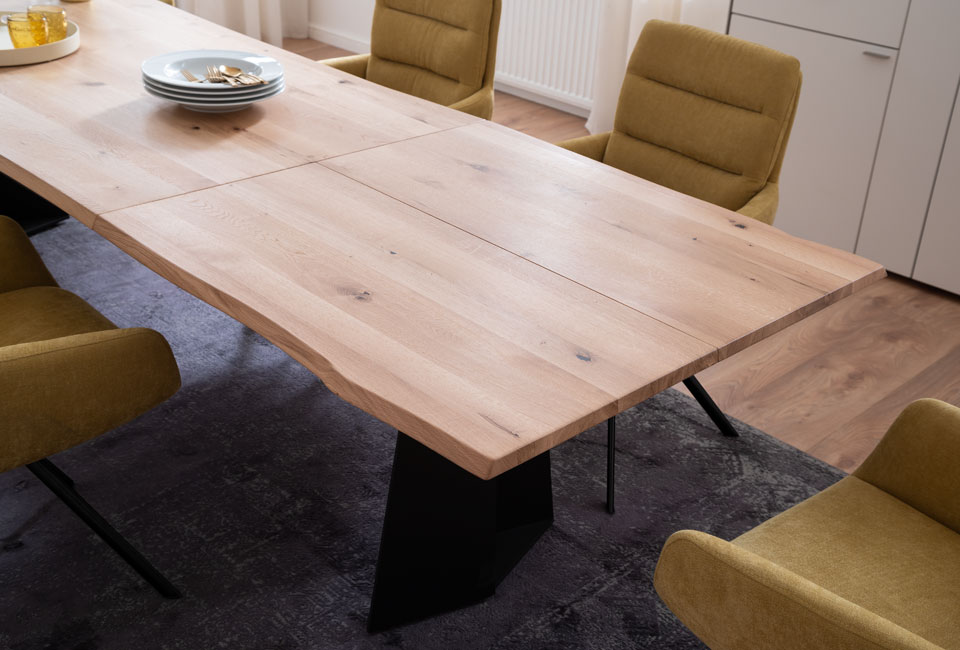 Dieses Produkt ist nur bei selektiven Handelspartnern erhältlich, gerne helfen wir Ihnen bei der Suche. Tischplatte mit Baumkantenopitk, alternativ auch mit schräger Plattenkante möglich (s. ET673).