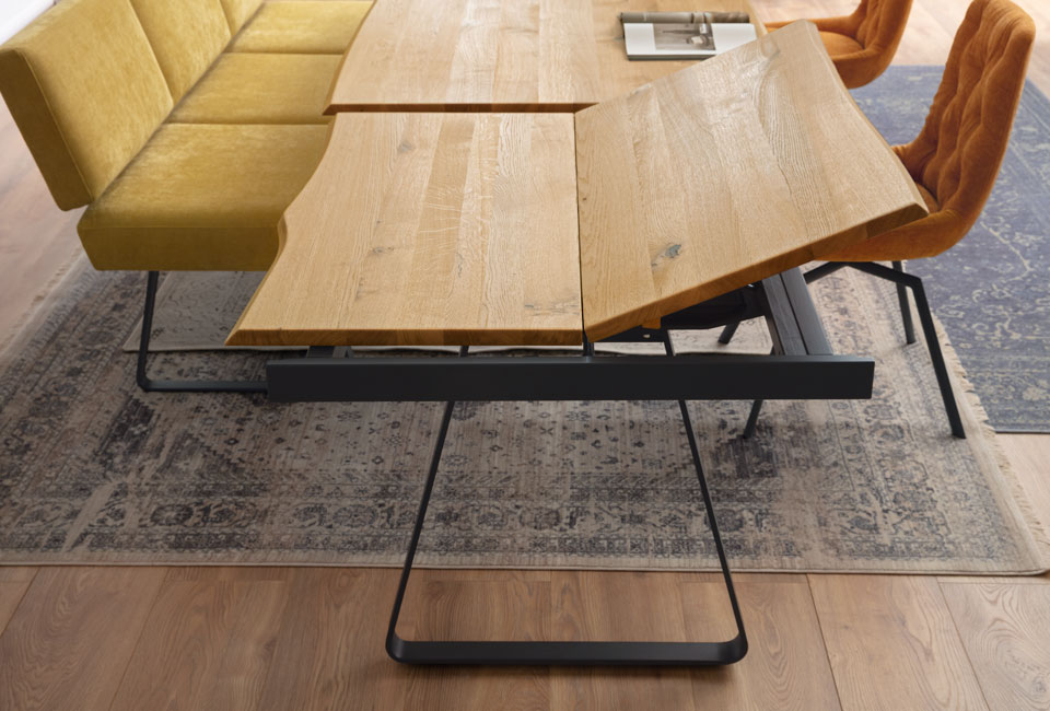 Tischplatte mit Baumkantenopitk, alternativ auch mit schräger Plattenkante möglich (s. ET313).