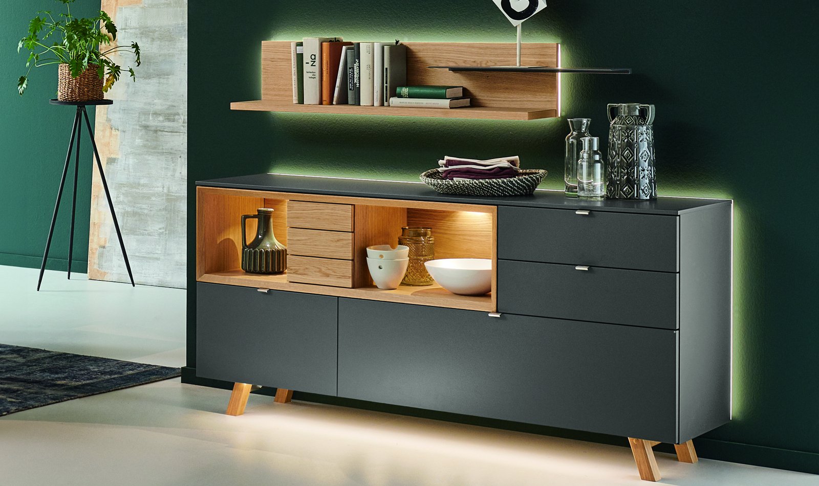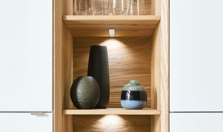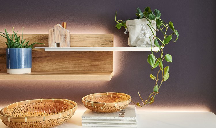 LED-Akzente heben Deko-Objekte hervor und eine angenehme Lichtstimmung läutet im Nu den Feierabend ein.