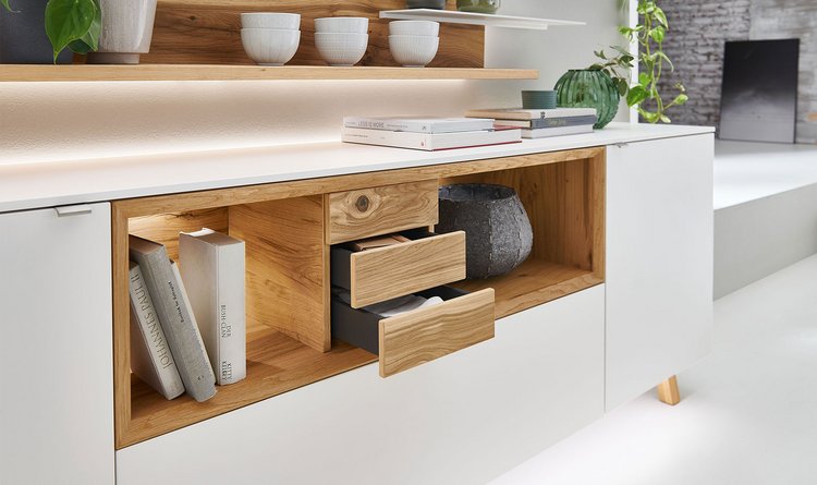 In den kleinen Schubkästen findet alles Platz, was in Wohn- und Esszimmern stets schnell zur Hand sein soll: Teelichter, Besteck und vieles mehr.