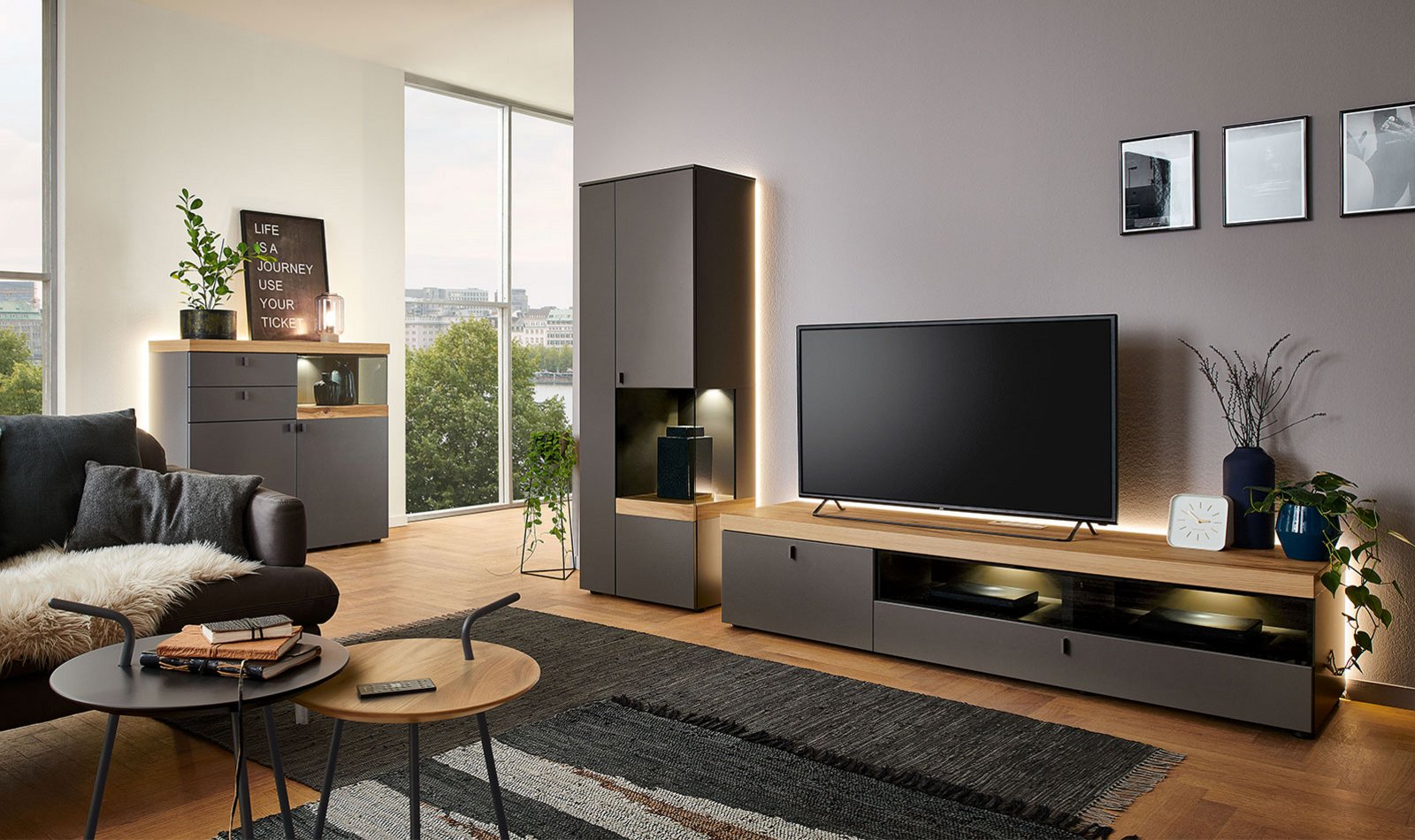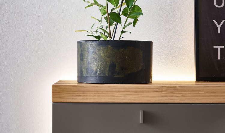 Lack und helles Holz sind markant kombiniert – hinterleuchtete Möbel in Schiefergrau liegen im Trend, sind cool und wohnlich zugleich.
