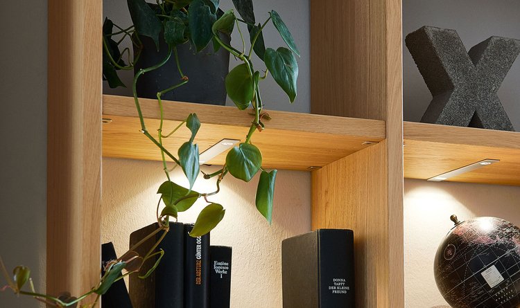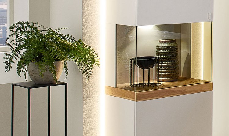 LED-Licht setzt Aktzente in Fächern und Regalen.